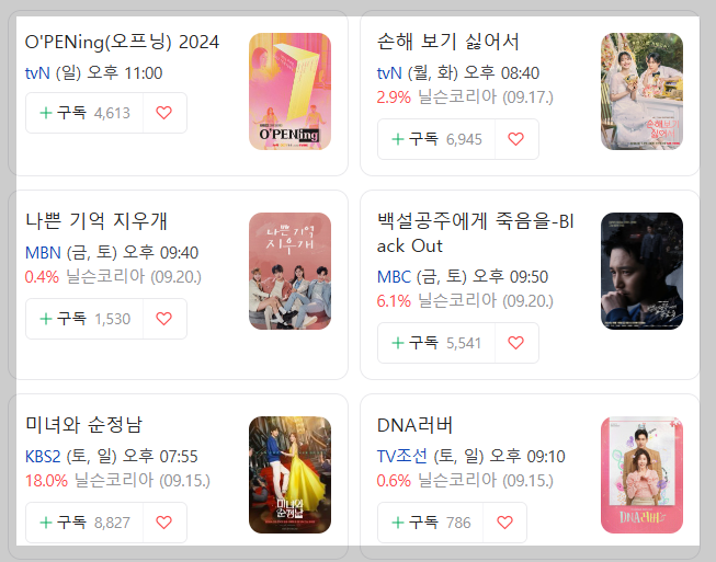 - 미니 시리즈: 짧은 회수로 구성된 드라마로, 다양한 장르의 이야기를 담고 있습니다.